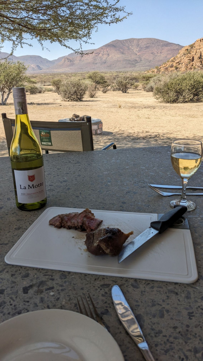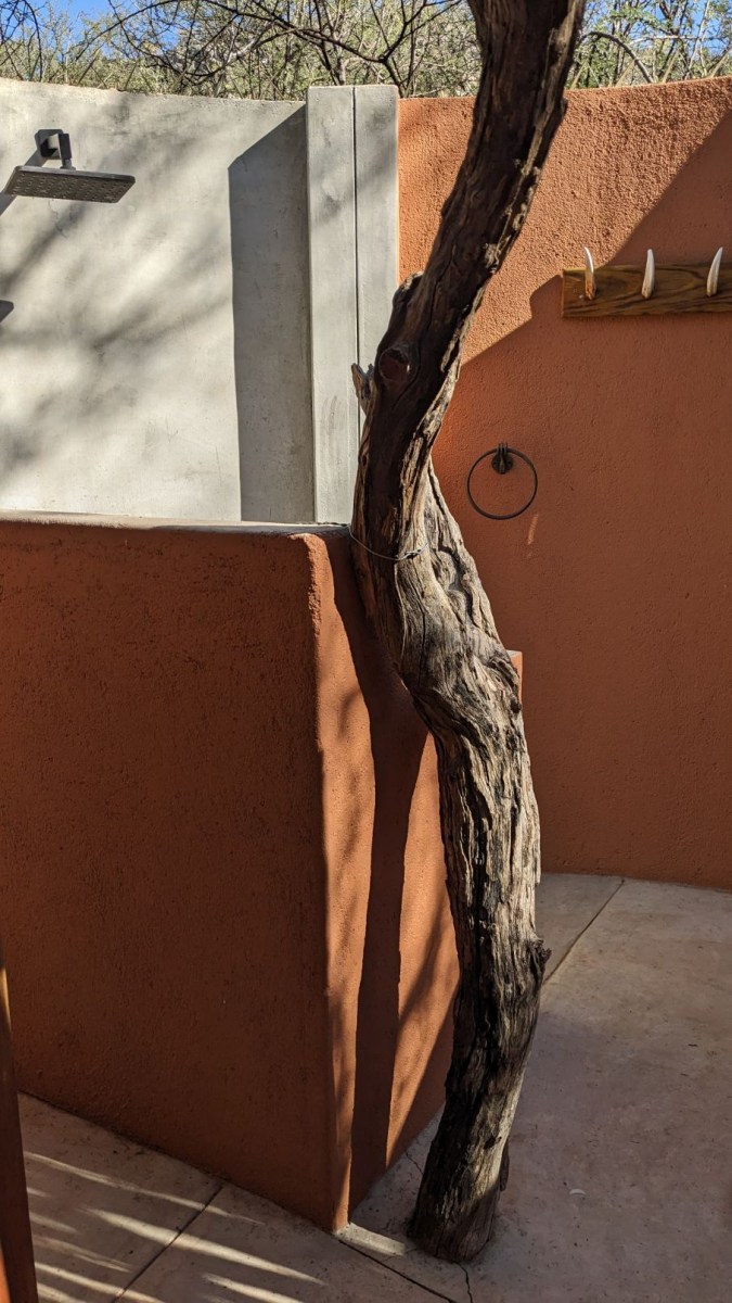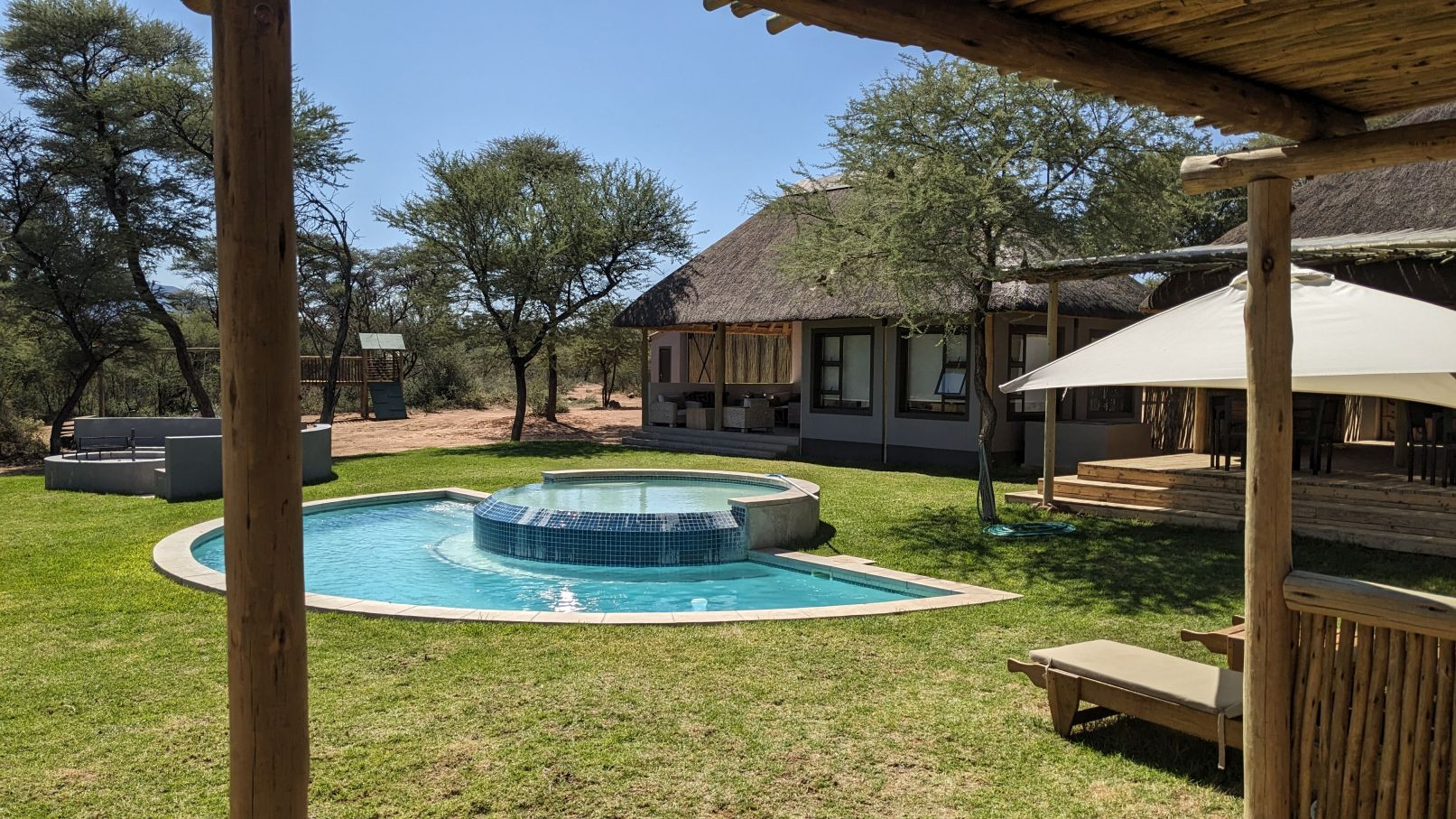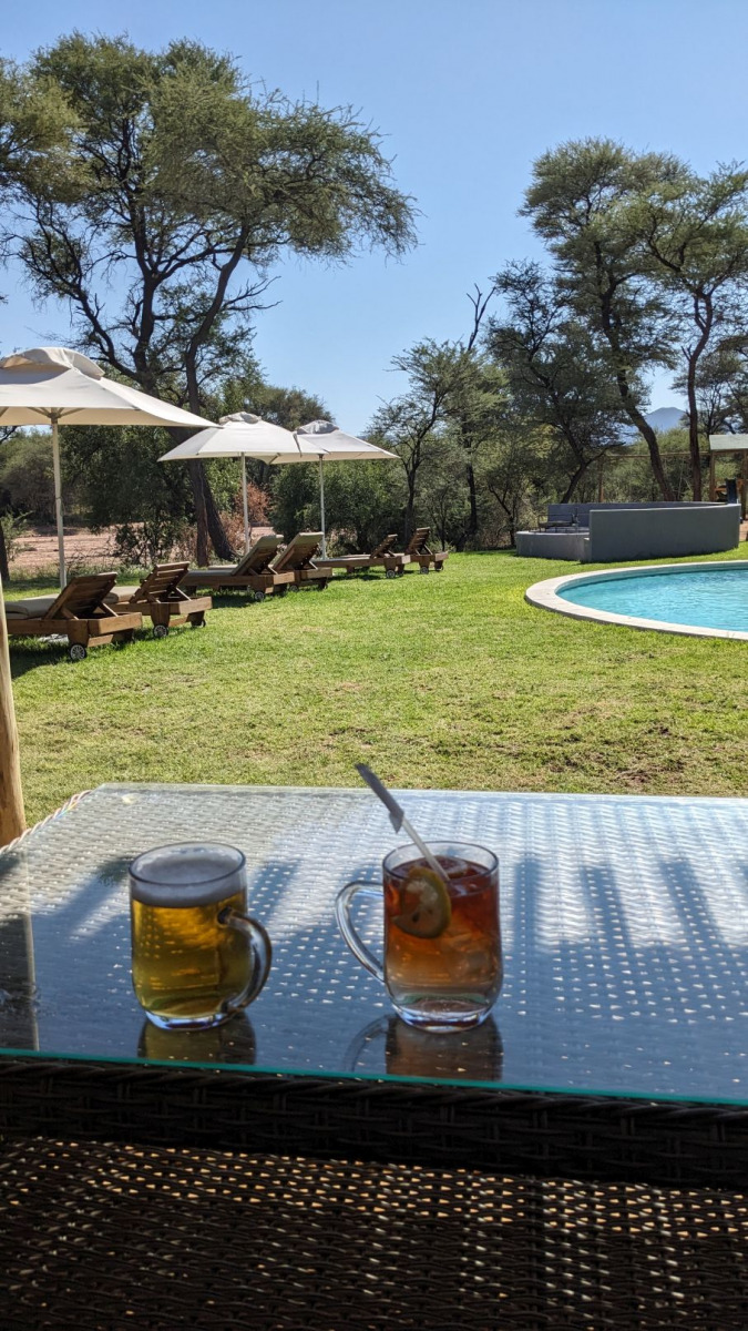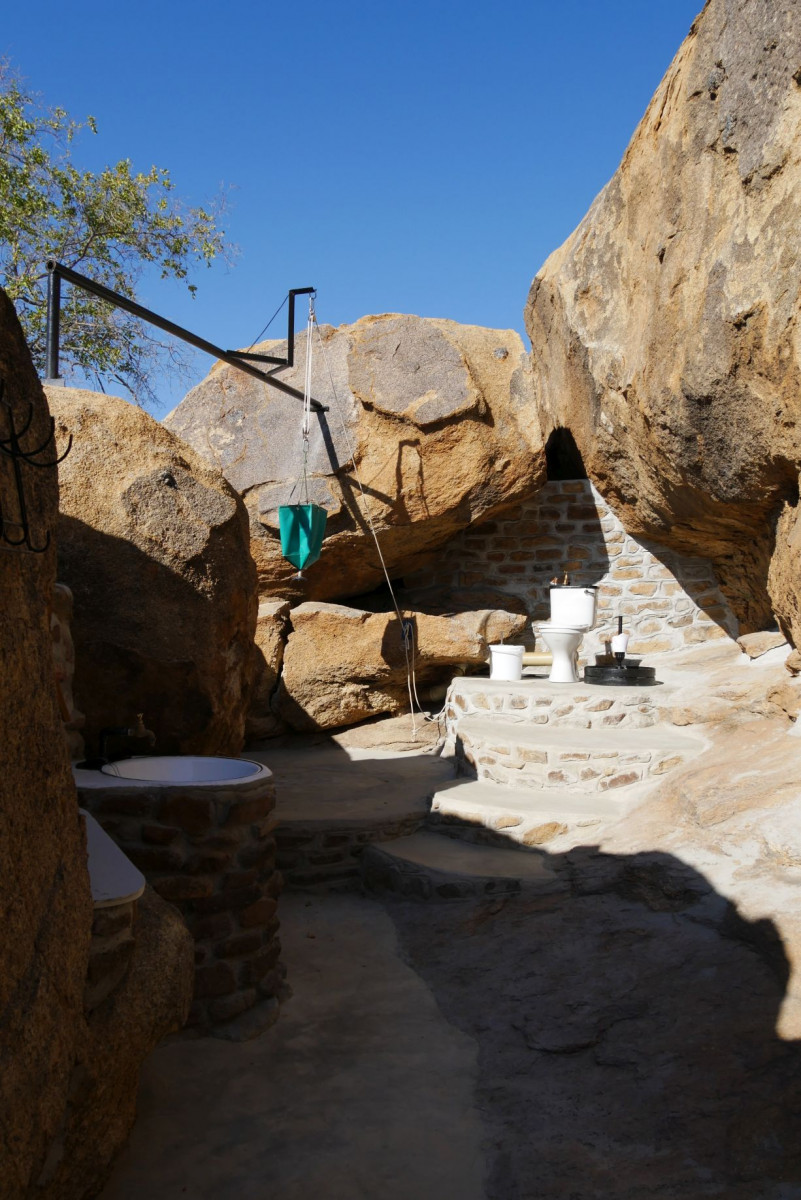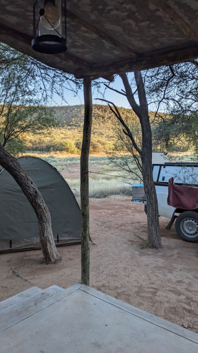 Wir bekamen in Omaruru den Tip nach TimBila zu fahren. TimBila ist ein neues Resort mit Lodge ( ca. 1000 € p.P. die Nacht), einer abseits stehenden privaten Villa (noch teurer pro Nacht), einem Farmhaus (welches man für 8 Personen buchen kann) – das uns sehr gut gefallen hat- und einer Campsite. Dort haben wir drei Nächte zugebracht. Die Campsite war sehr schön angelegt (weit weg von den anderen Plätzen) und einem tollen Ablution- Haus (sogar mit Kühlschrank):