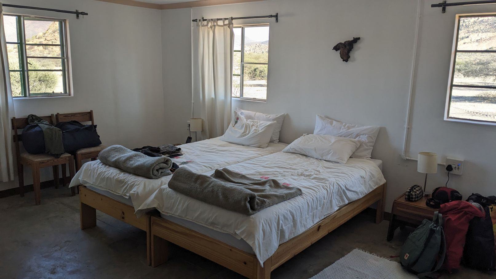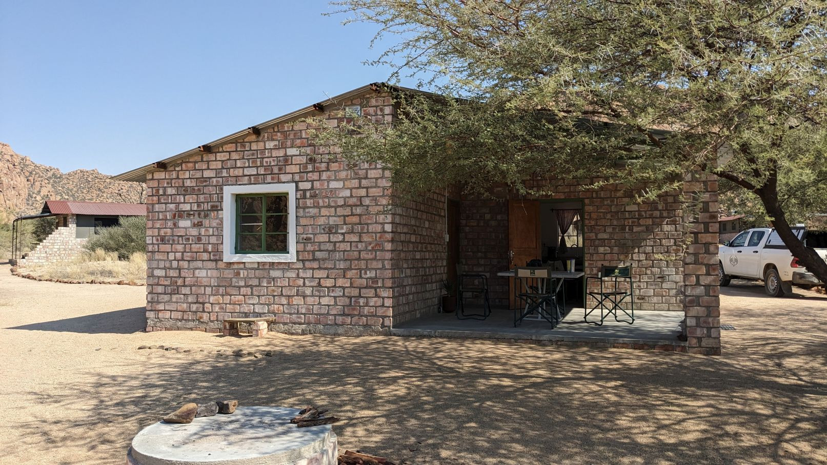 Zuerst waren wir auf der Farm Omandumba. Die Campsites dort kennen wir schon und finden sie sehr schön, vor allem weil sie direkt neben dem San-Museum sind. Diesmal sind wir aber im Bushcamp gewesen. Dort gibt es ein kleines Farmhaus für Selbstversorger, das hat uns absolut begeistert: